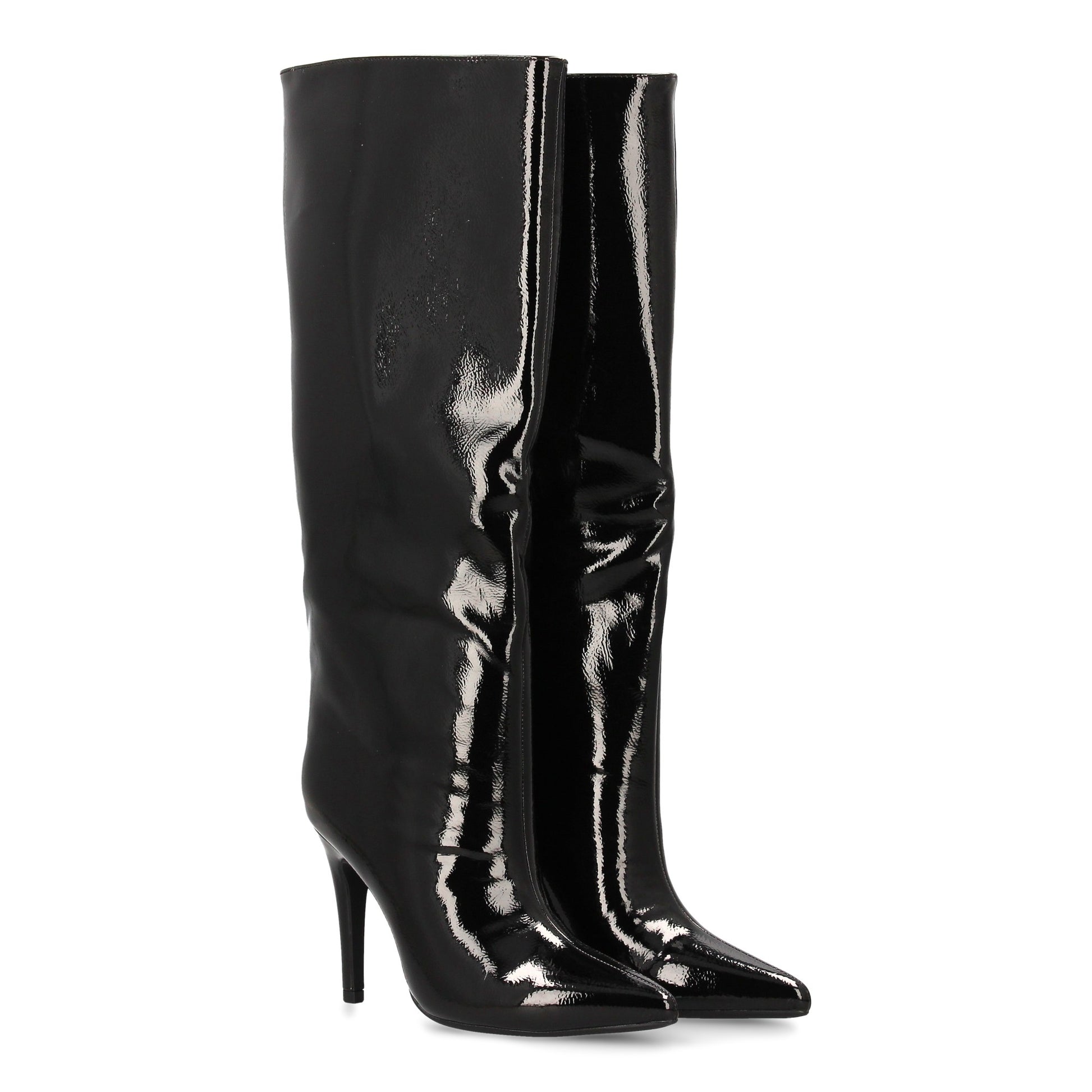 Bota alta mujer con efecto charol brillantes con cierre de cremallera y tacon y punta fina. Estampado liso ideal temporada otoño invierno.