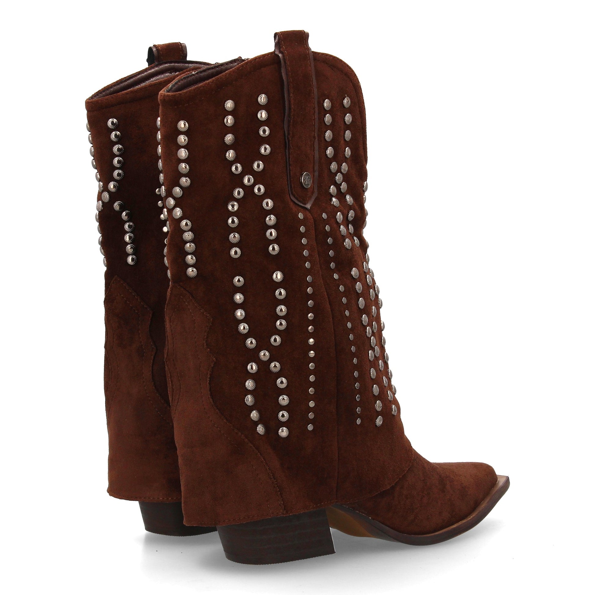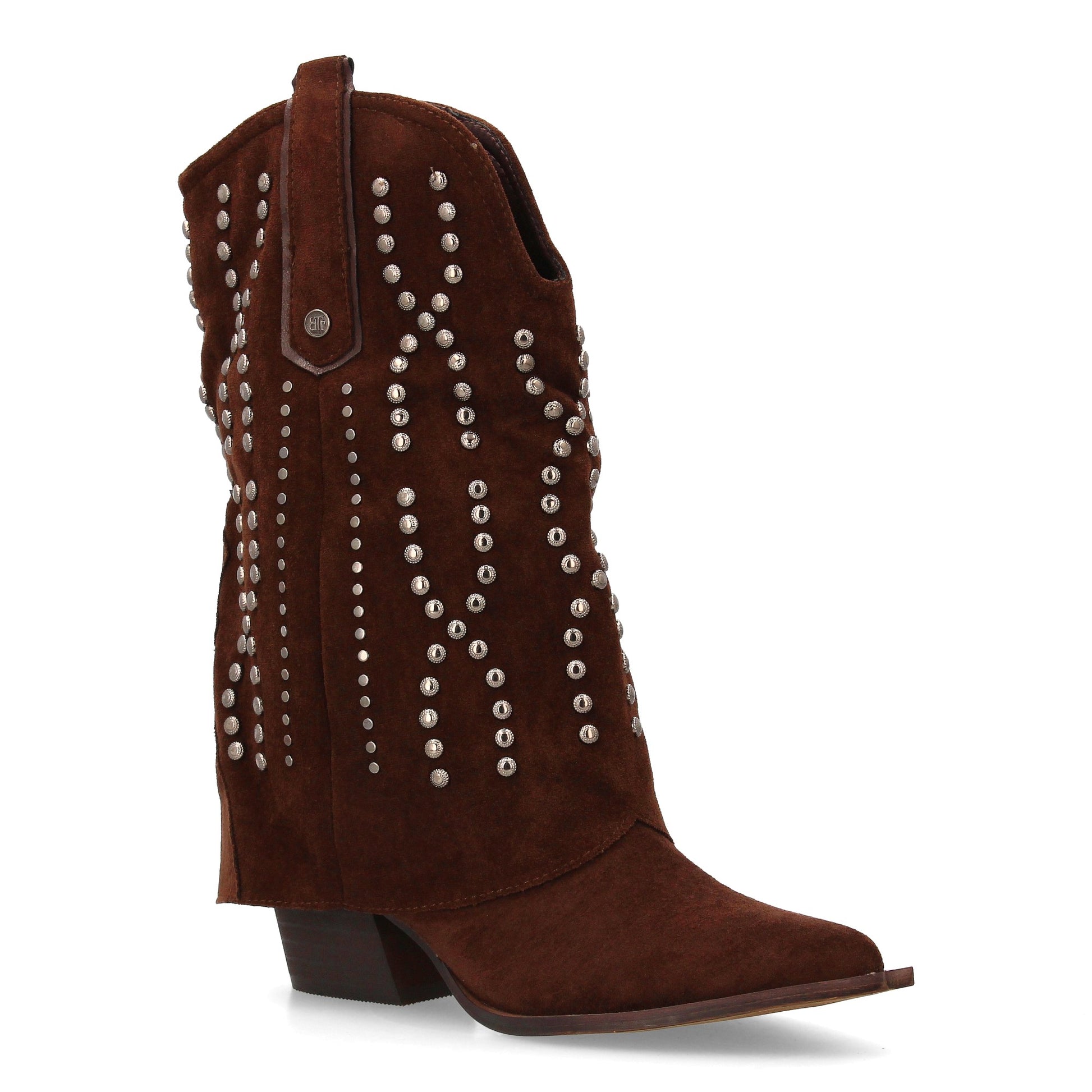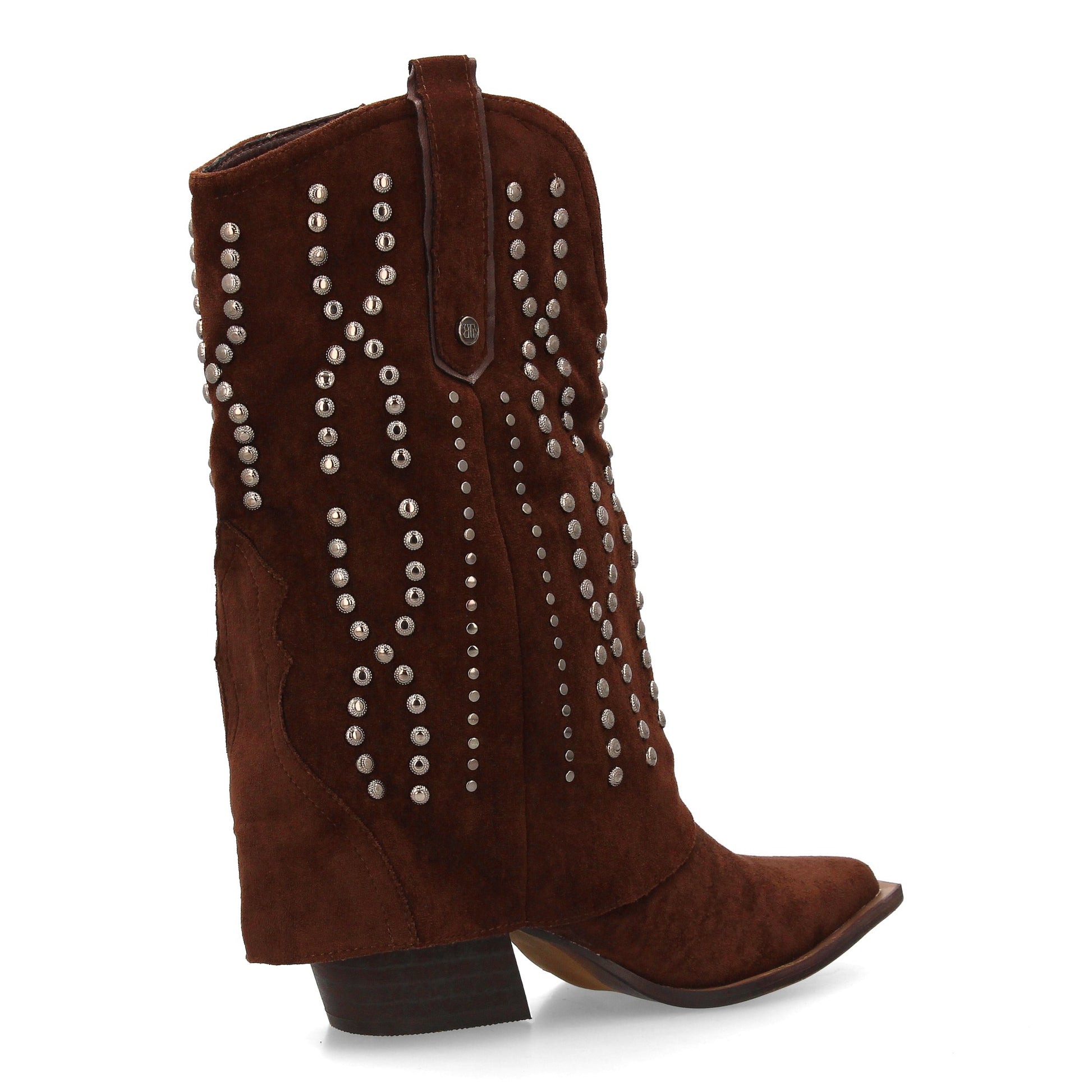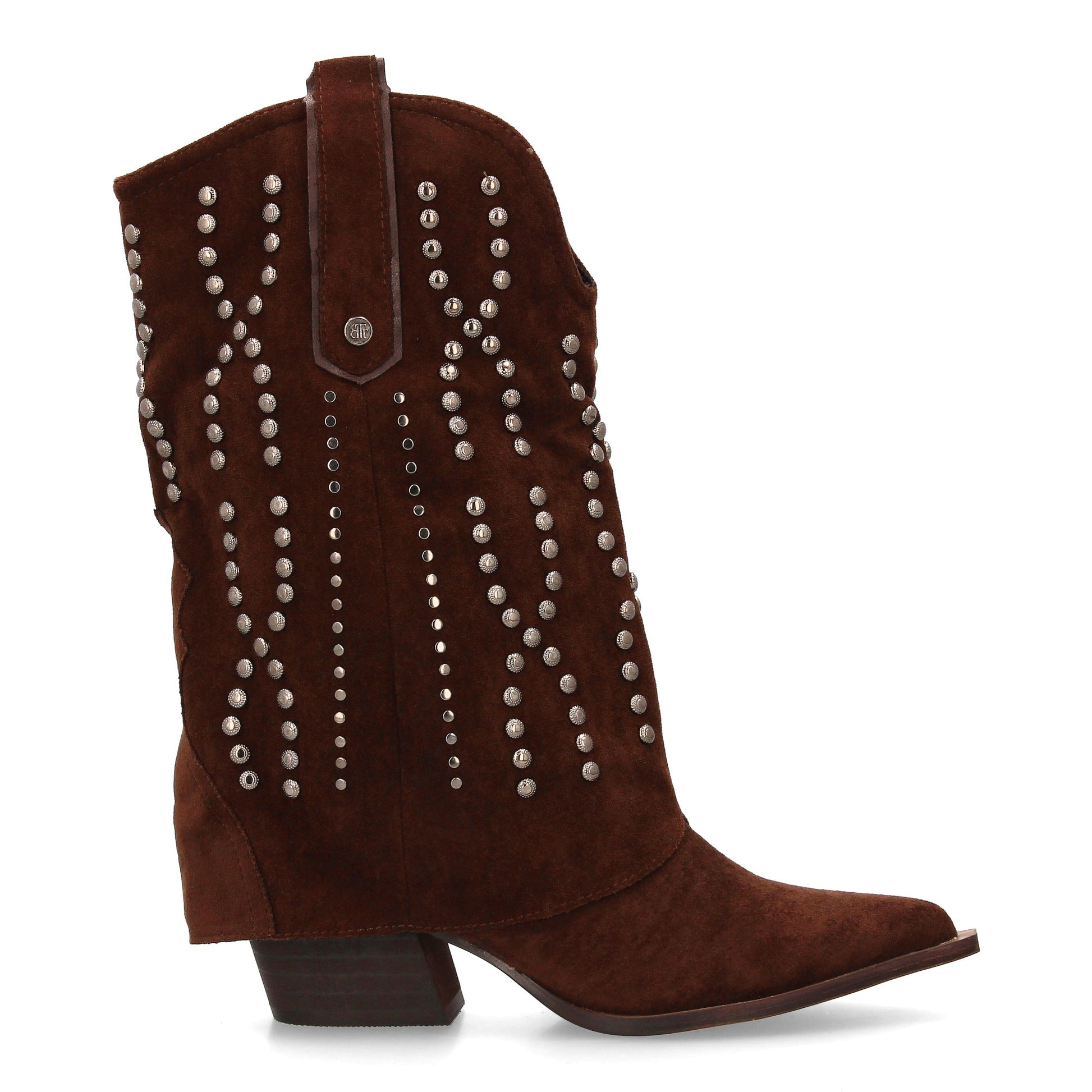 Botín cowboy para mujer con caña media y diseño campero. Decorado con tachuelas metálicas en patrón geométrico punta fina y tacón cubano cuadrado. Ideal para la temporada otoño invierno.