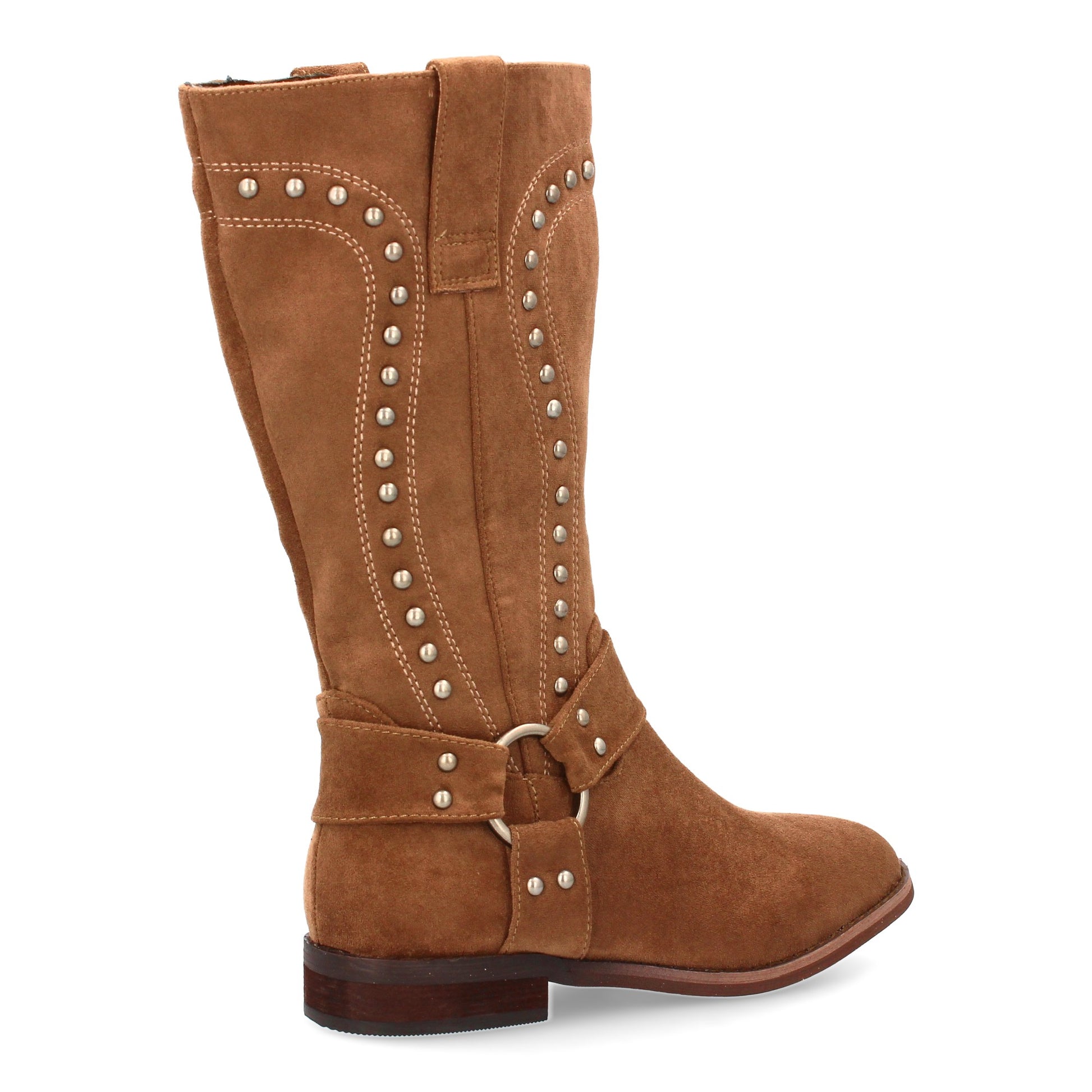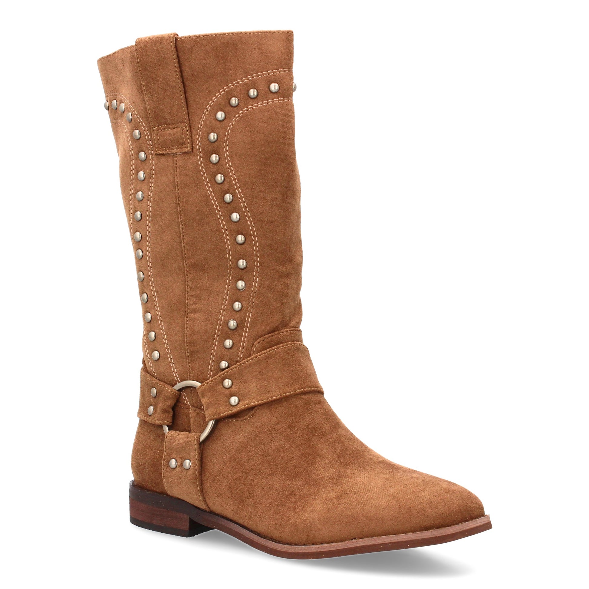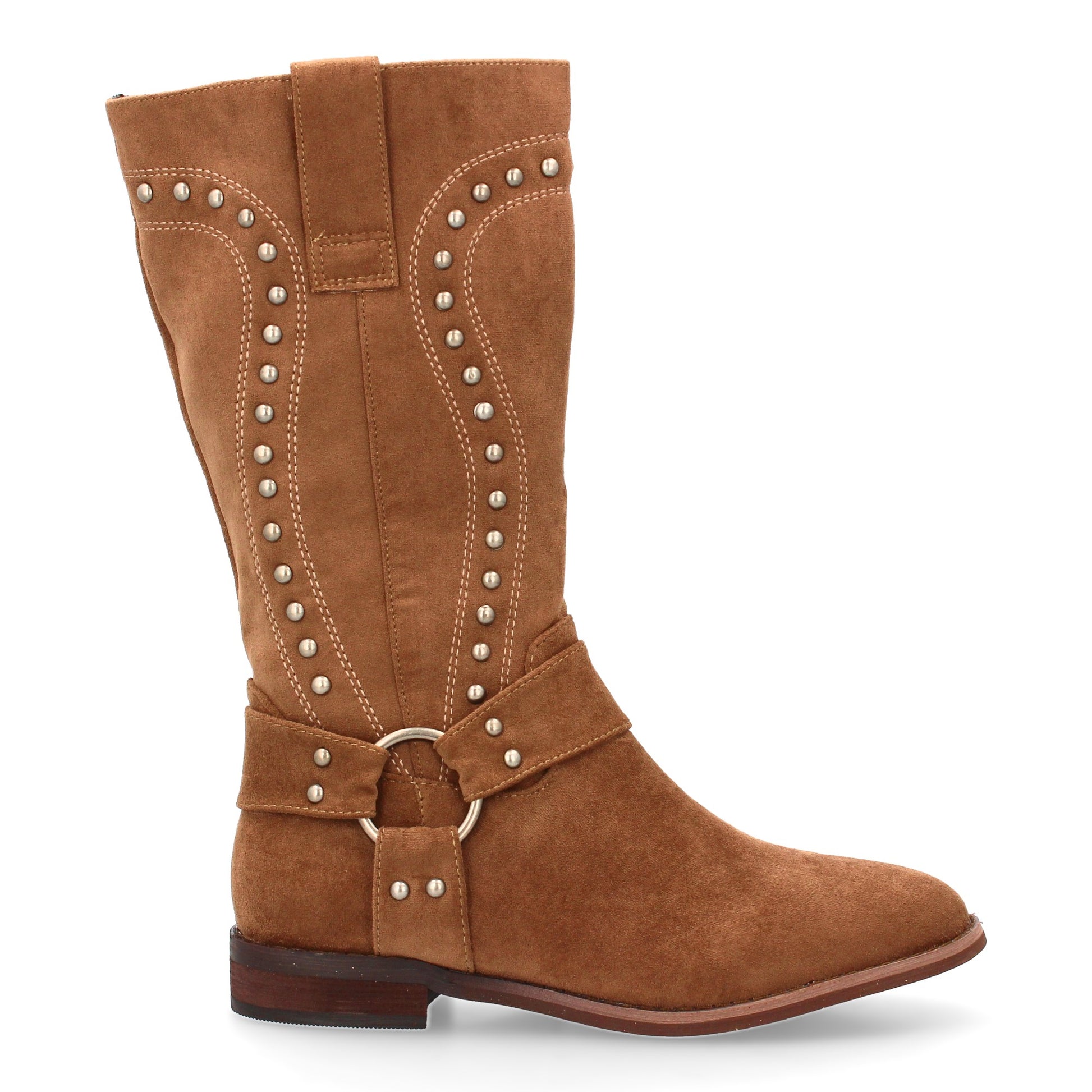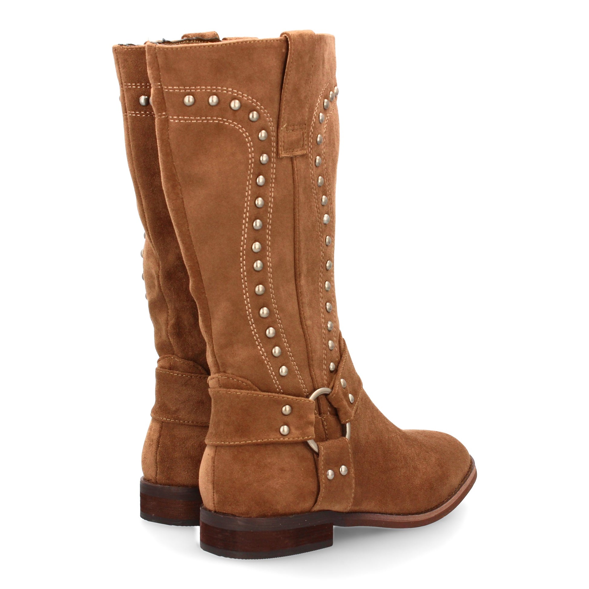 Bota de media caña con detalles metálicos. Suela plana comoda uso diario. Tachuelas decorativas y cierre de caña. Estampado liso para la temporada Otoño Invierno. Ideal para mujer.
