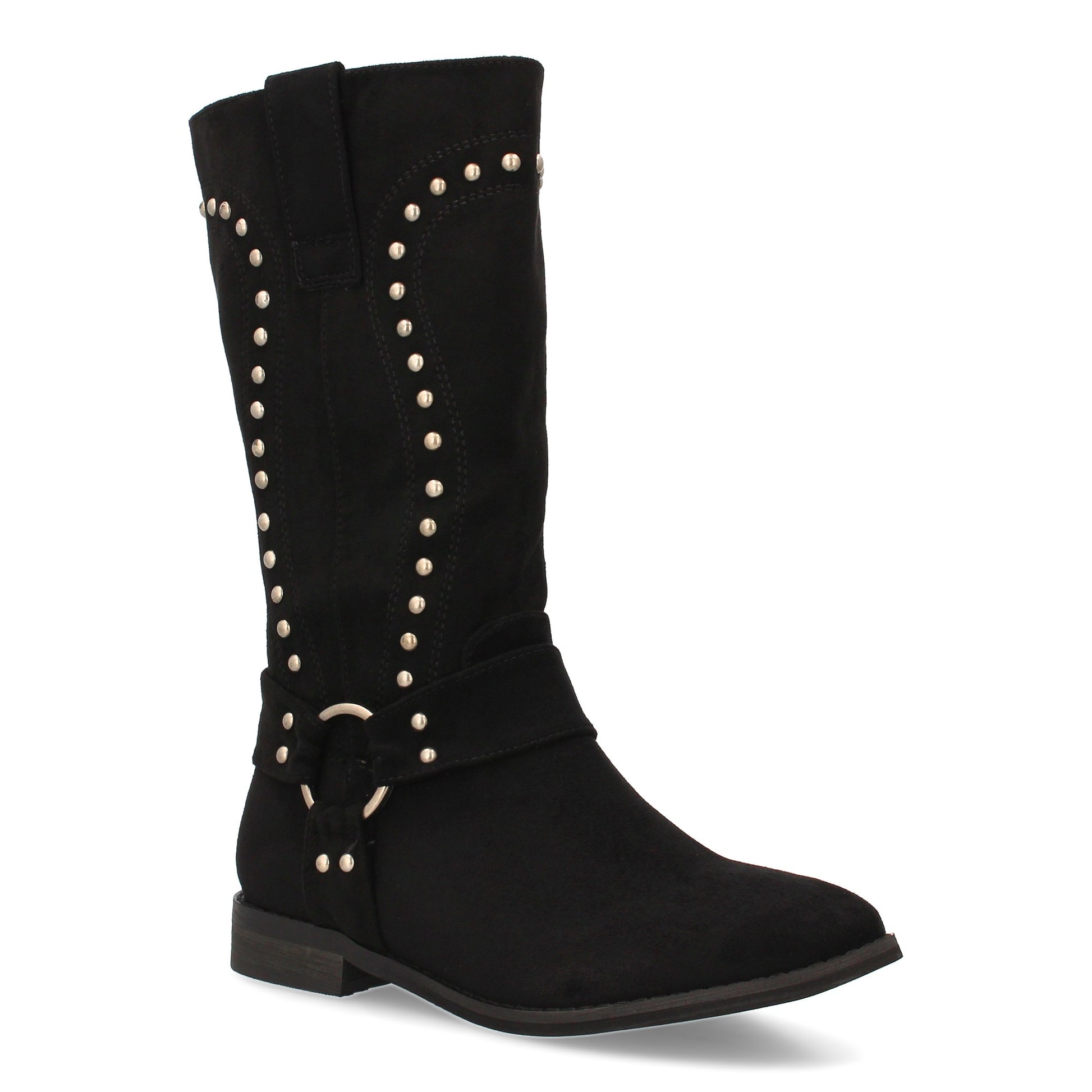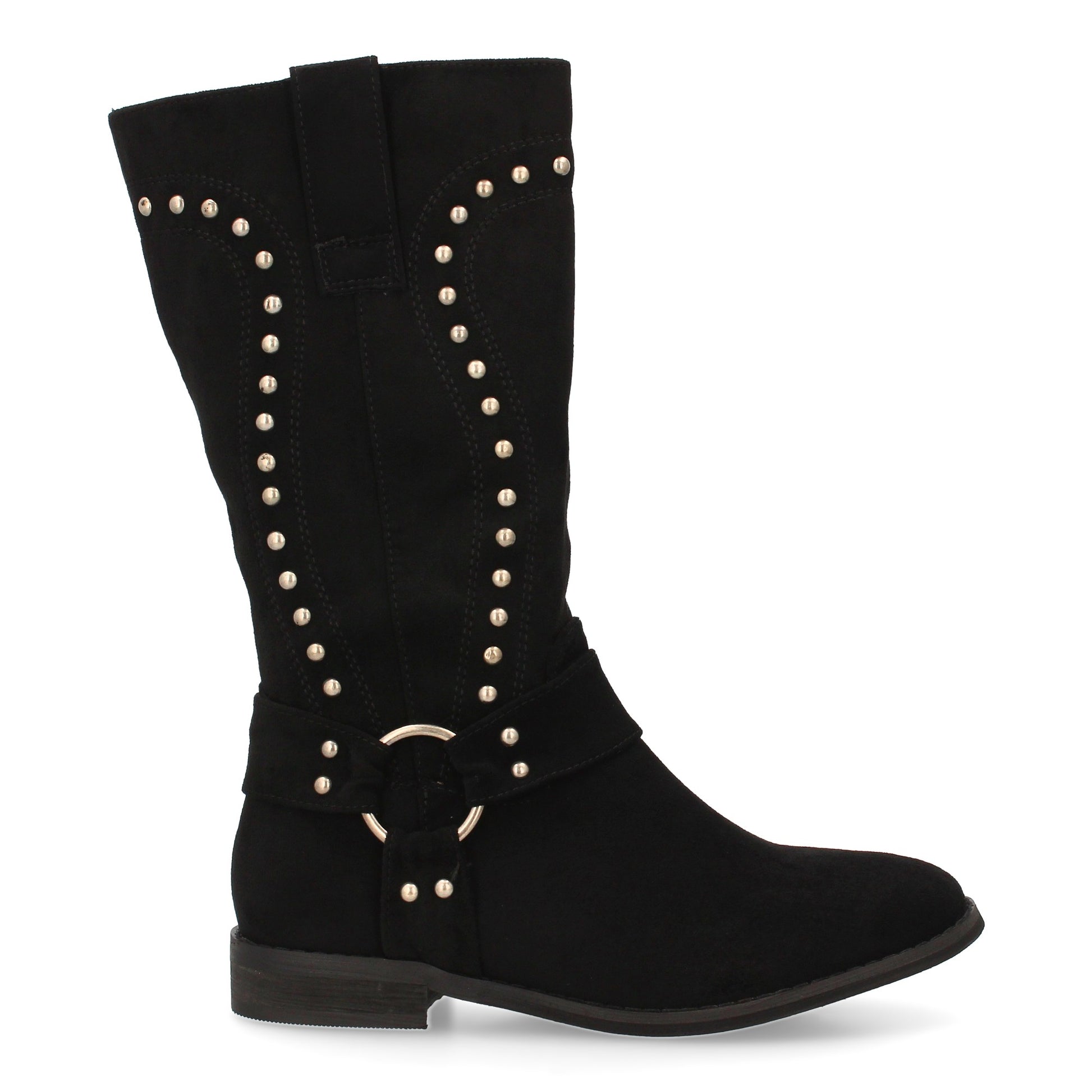 Bota de media caña con detalles metálicos. Suela plana comoda uso diario. Tachuelas decorativas y cierre de caña. Estampado liso para la temporada Otoño Invierno. Ideal para mujer.