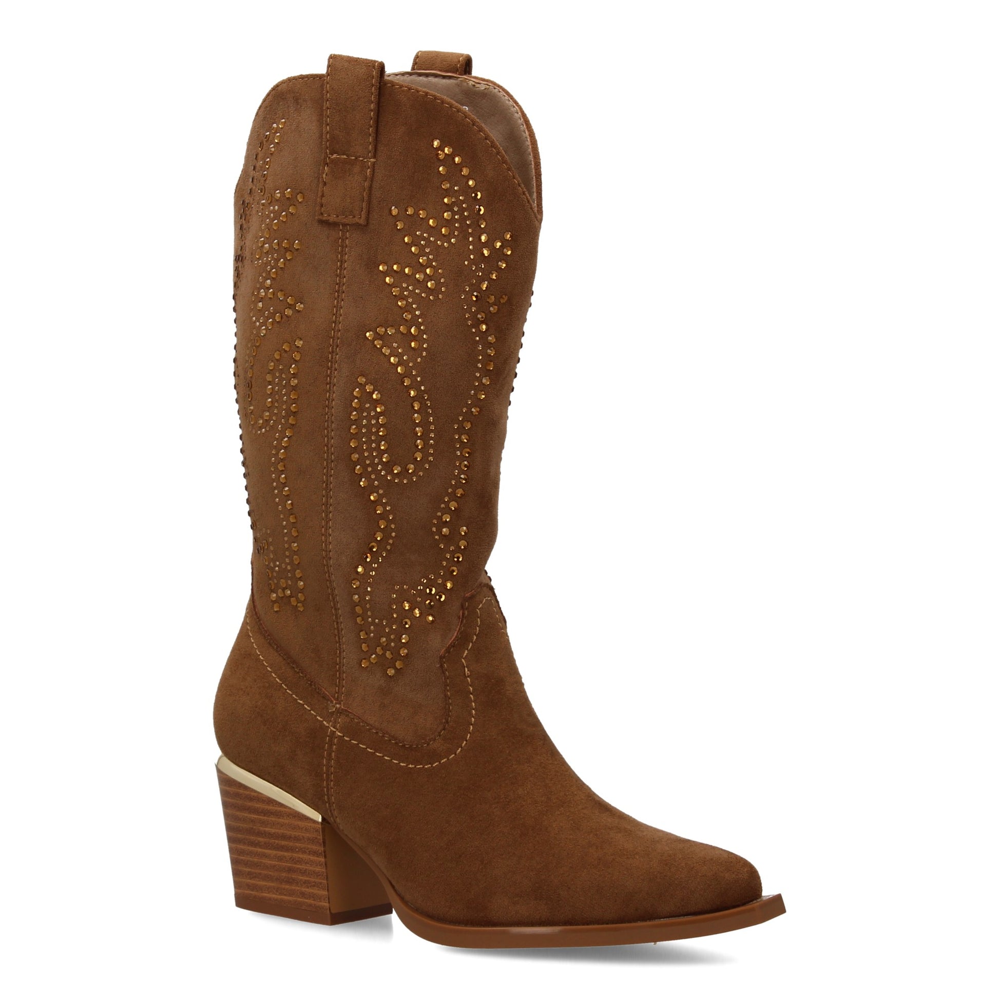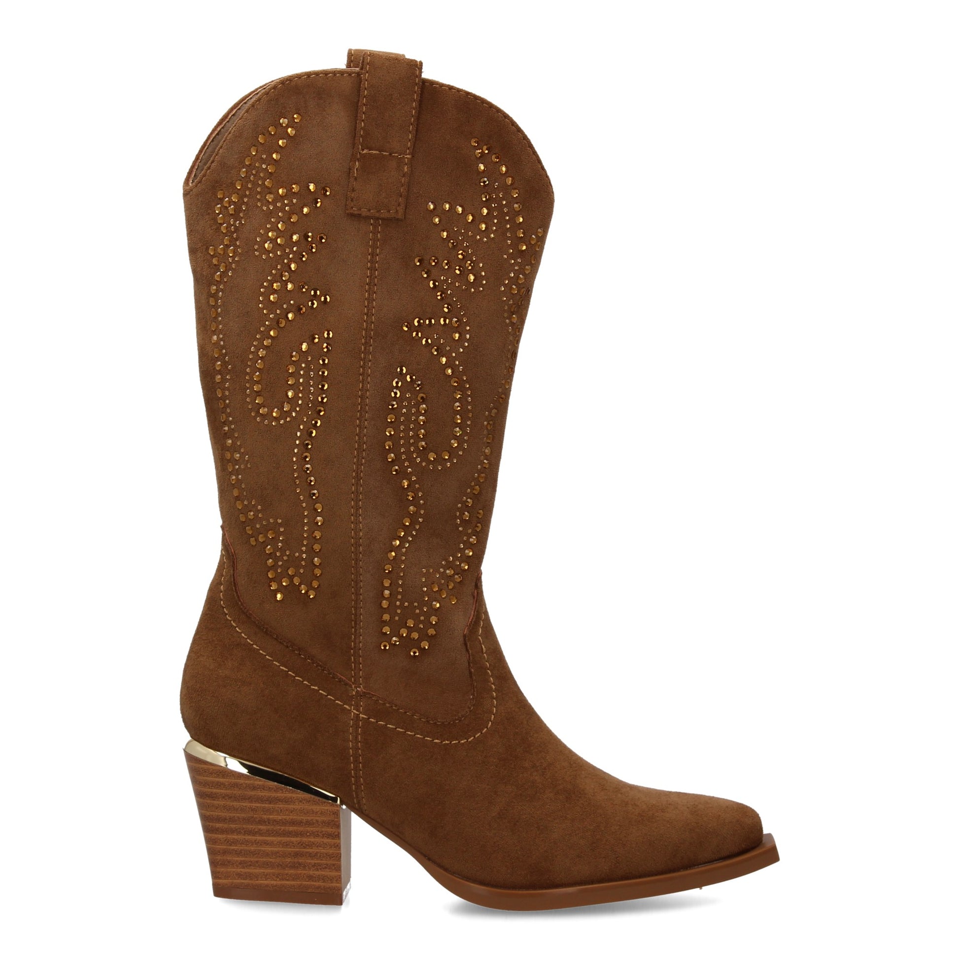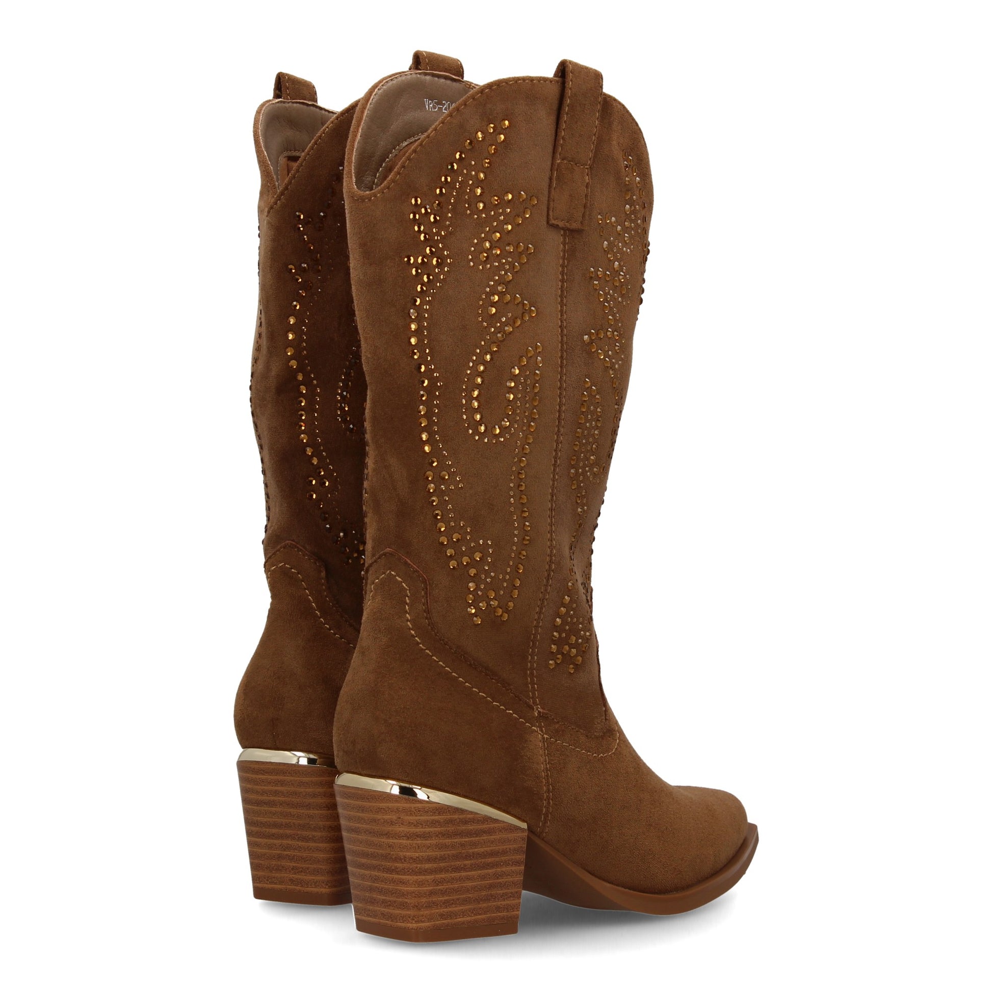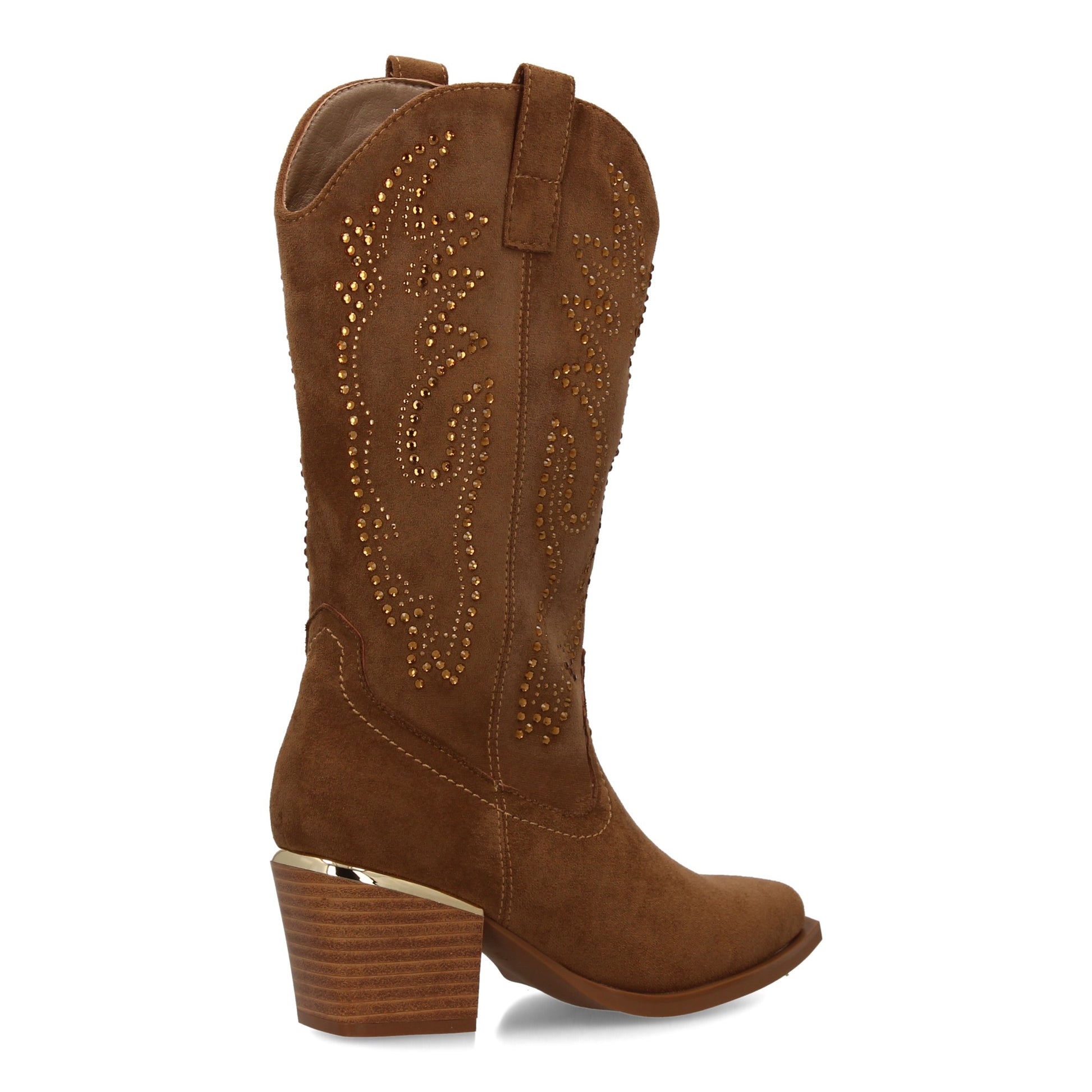Bota de Mujer con Detalles brillantes elegantes en la caña y Tacón comodo para Estilo Casual o Formal Ideal para otoño invierno cierre de cremallera lateral y adorno metálico en el tacon.