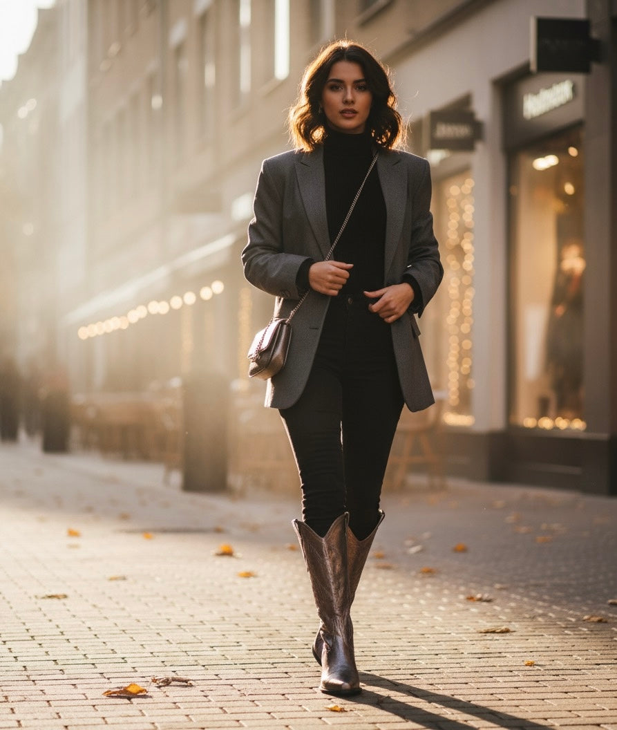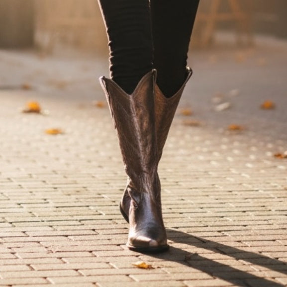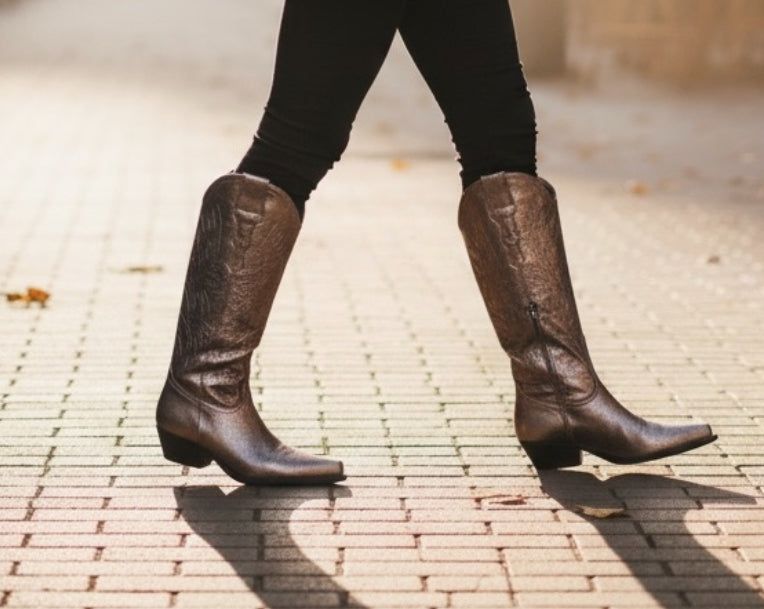 Bota cowboy de caña alta con bordados decorativos y tacón bajo comodo. Diseño clásico de punta fina cierre de cremallera ideal para mujer temporada Otoño invierno